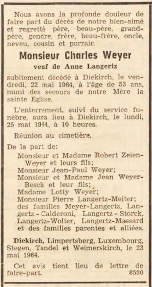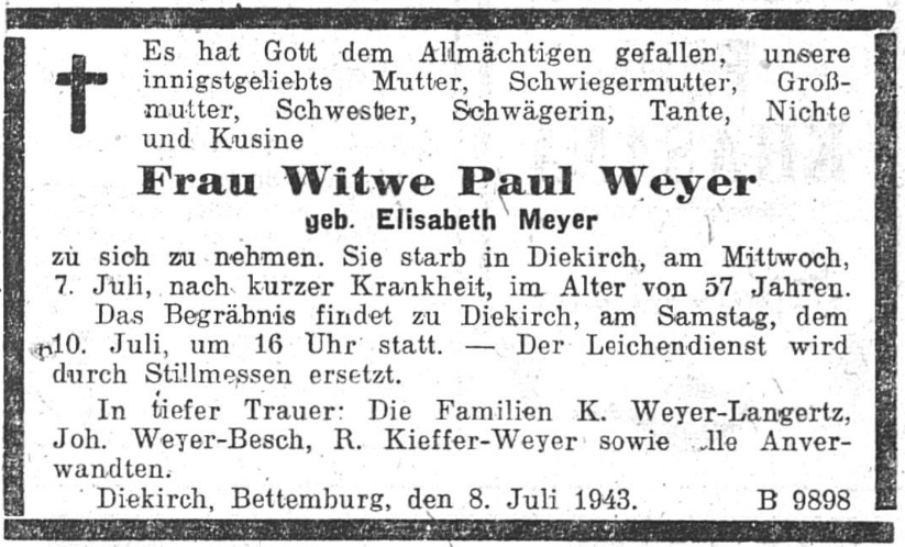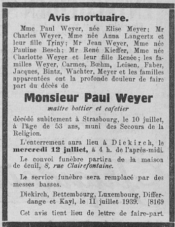 Die Sorge um Nachwuchs war immer eine akute und es wurden alle erdenklichen Möglichkeiten in Erwägung gezogen, um jüngere Kräfte zu gewinnen. Und wenn das Schicksal eine erste Kraft hinwegrafft, wie beim Jahresausflug nach Straßburg, vom 8. bis 10. Juli den unvergesslichen Kameraden Paul Weyer, der während 42 Jahren sich der Gesellschaft verschworen hatte, so muss mit größter Geduld versucht werden, den erlittenen Verlust auszugleichen. Dieser harte Schicksalsschlag holte der so glänzend sich angelassenen Elsassreise ein jähes Ende bereitet. Nach einem in der Orangerie stark besuchten Konzert und der herzlichen Abendfeier im Kreise der Luxemburger Kolonie in Straßburg, fand der Vogesenausflug in gedämpfter Stimmung und mit tiefer Trauer im Herzen statt. Das Vereinsregister trägt ganz lakonisch nach der letzten Einschreibung vom 3. September die Mitteilung: »Ferien wegen Kriegsausbruch«. |