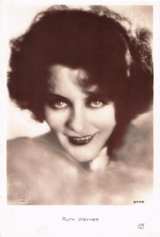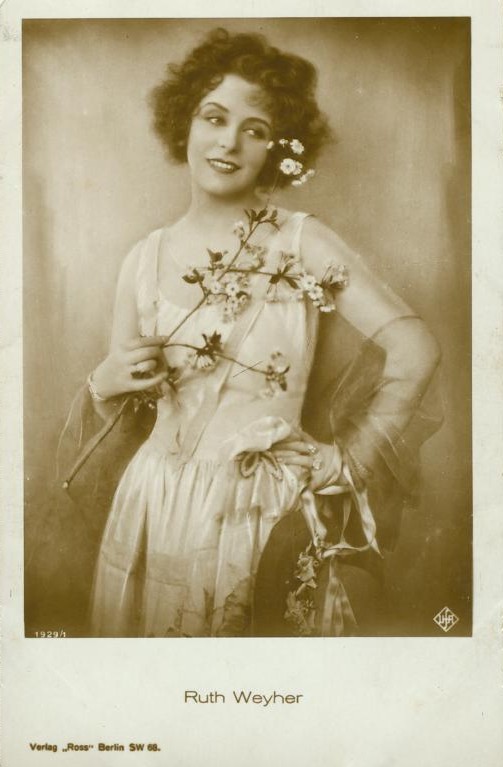 Ruth Ellen Weyher (* 28. Mai 1901 in Neumark/Westpreußen, (heute: Nowe Miasto Lubawskie, Polen) † 27. Januar 1983 in München) war eine deutsche Stummfilmschauspielerin. Die Tochter des Oberjustizinspektors Paul Ferdinand Weyher und seiner Frau Lätitia Theone geb. Schulze wuchs in Danzig auf, bis sie mit ihren Eltern und ihrem Bruder 1914 nach Halle zog. Dort besuchte sie die Kunstgewerbeschule und beschäftigte sich mit der Malerei. Auf einem Konservatorium nahm Gesangsunterricht, mit dem Ziel Opernsängerin zu werden. Eine Krankheit, bei der sie die Gesangsstimme verlor, beendete ihr Vorhaben. In Berlin geht sie 1919 auf Max Reinhardts Schauspielschule und wagt nur kurze Zeit später ihre ersten Schritte beim Film in DER HIRT VON MARIA SCHNEE. Lobende Erwähnung, vor allem ihrer Schönheit wegen, fand sie in der 1922er Großproduktion STERBENDE VÖLKER. Ihr großer Erfolg kam 1923 mit Artur Robisons expressionistischem Film SCHATTEN. Schauspielerische Reife wurde ihr bescheinigt. Es folgen Durchschnittsfilme, mit denen Weyher selbst unzufrieden ist. Kritiker sahen nicht ihr Schauspieltalent, nur ihr Aussehen. Ein weiterer Höhepunkt ihrer Filmkarriere wurde GEHEIMNISSE EINER SEELE (1925/26), der erste psychoanalytische Film. Neben Lilian Harvey und Willy Fritsch zeigte sie 1926 ihr komödiantisches Talent in die Titelrolle der Operettenverfilmung der Komödie DIE KEUSCHE SUSANNE. 1928 gründete sie ihre eigene Filmproduktionsgesellschaft, die Ruth Weyher-Film GmbH. Nach einem einzigen Film, Was ist los mit Nanette mit ihr in der Titelrolle stellte sie ihre Tätigkeit als Produzentin ein. Am 2. Juli 1932 heiratete sie den Münchner Verleger und Buchdruckereibesitzer Dr. Hans Geiselberger und beendete ihre Karriere. Filmografie